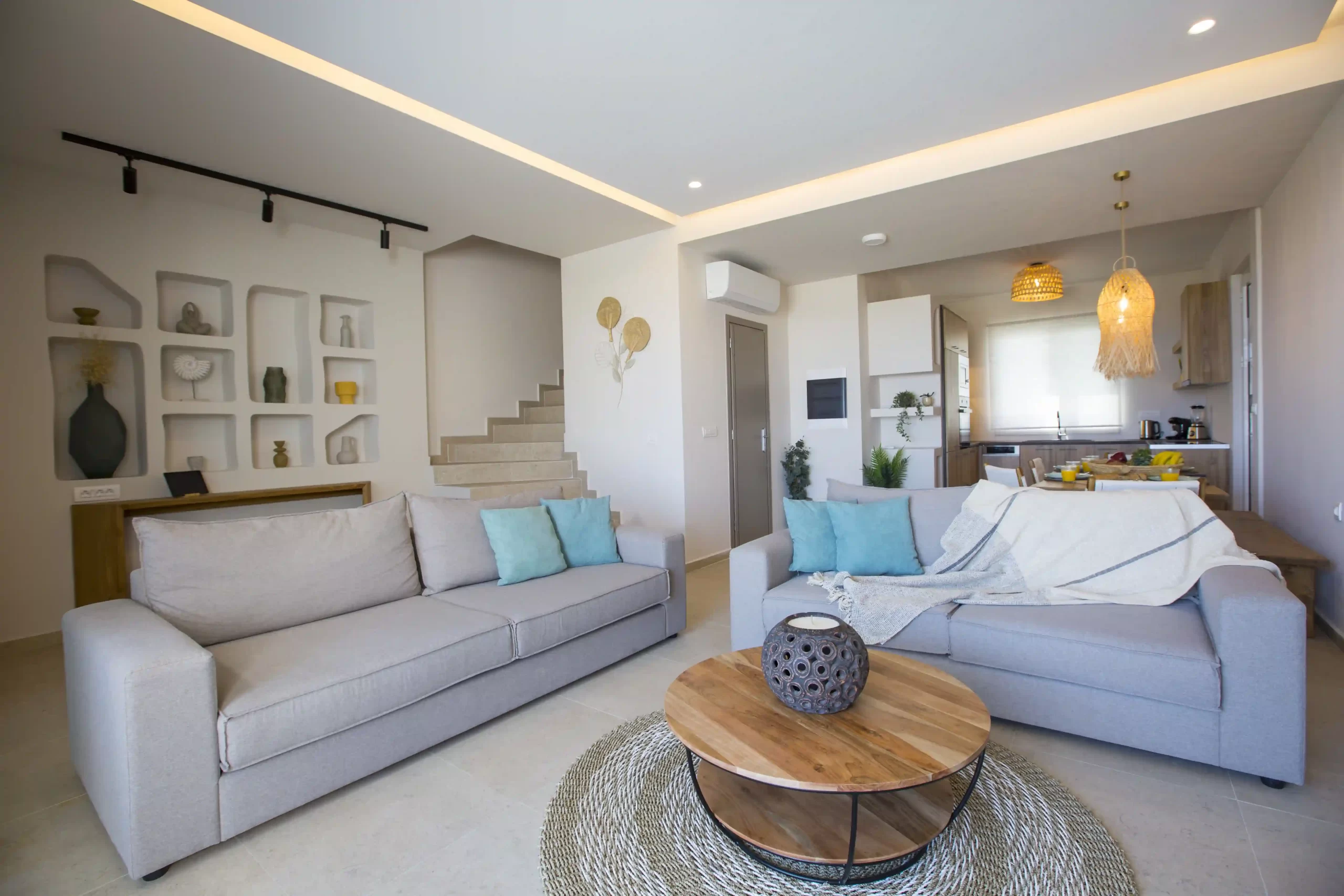 Villa Erato is a place of comfort and thoughtful details. The main entrance leads into a bright, open-plan living and dining area, perfectly connected to a fully equipped kitchen. This space is ideal for creating shared memories. The design, which includes the use of local materials like Lindos stone and wood, creates a peaceful atmosphere that blends seamlessly with the natural surroundings.